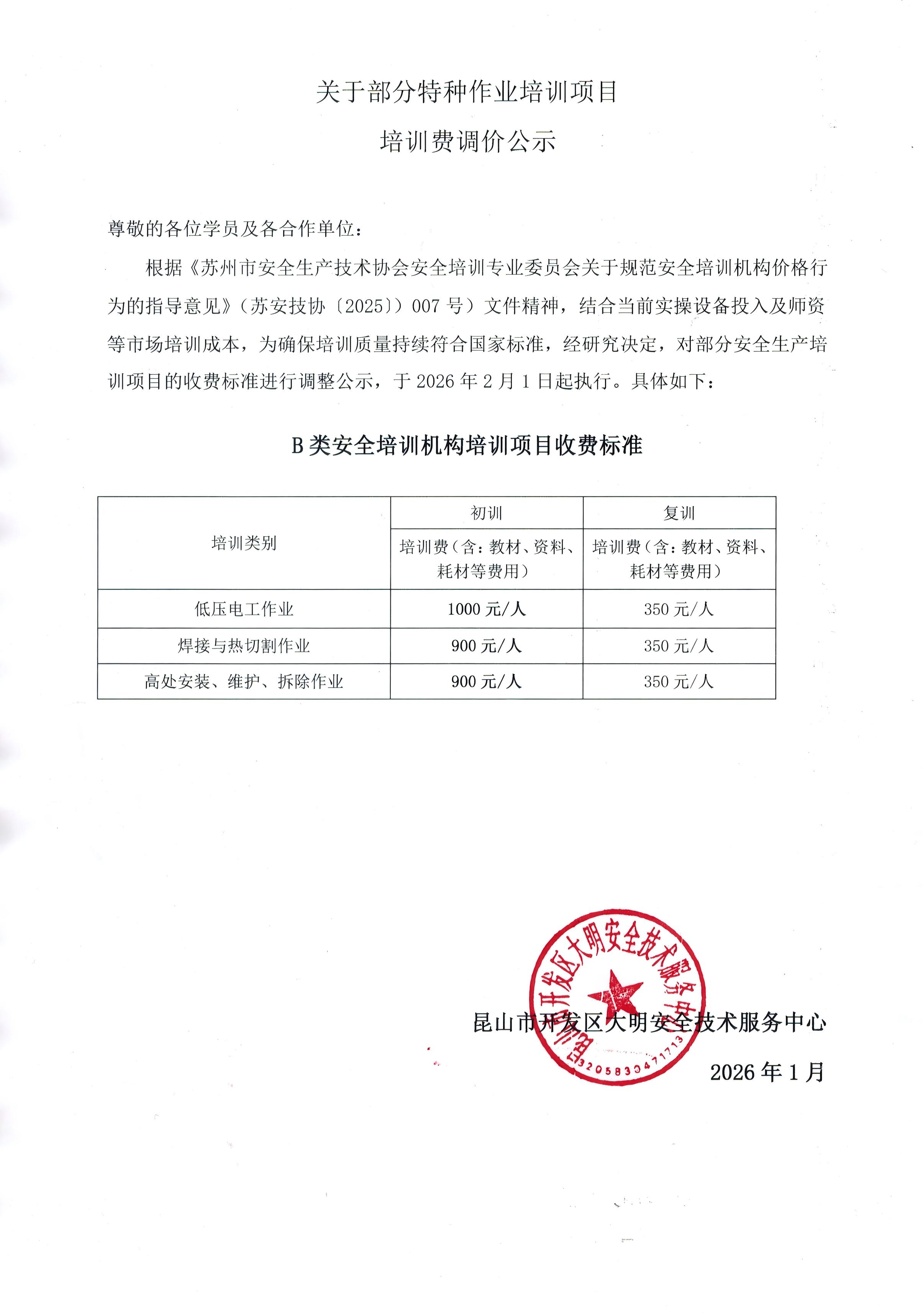 低压电工、高处作业及焊接与热切割作业三个特种作业初训调价公示